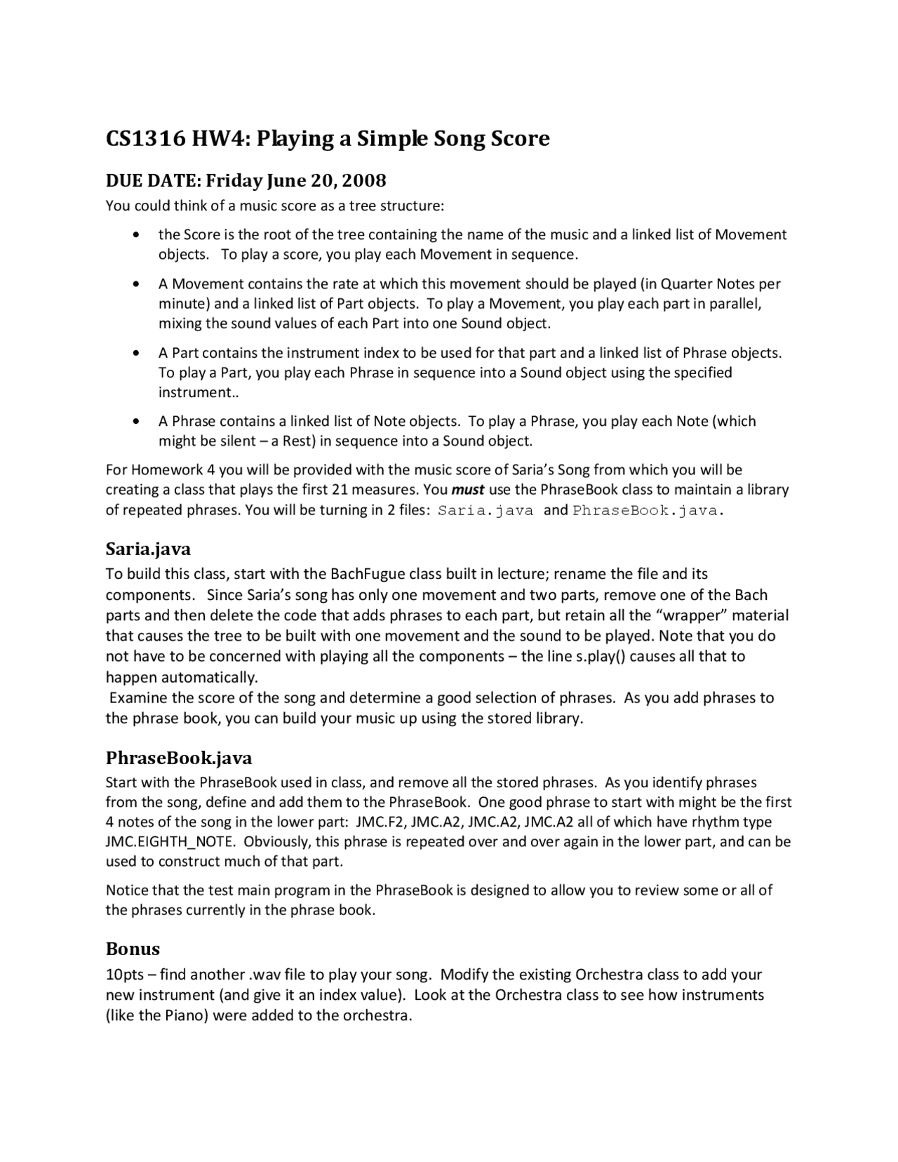 Homework 4 For Playing A Simple Song Score Cs 1316 Assignments Computer Science Docsity